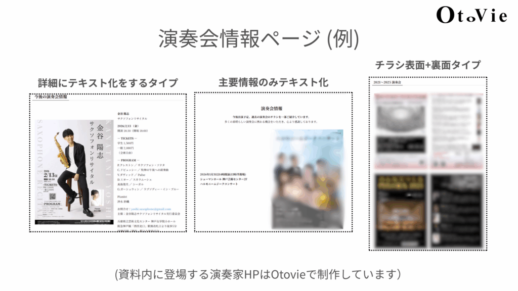 サイトを訪れた方が、「この方はどんな活動をしてきたのか、しているのか?」をすぐに理解できるよう、過去と未来の演奏会情報をまとめた「Concert」ページを用意しました。