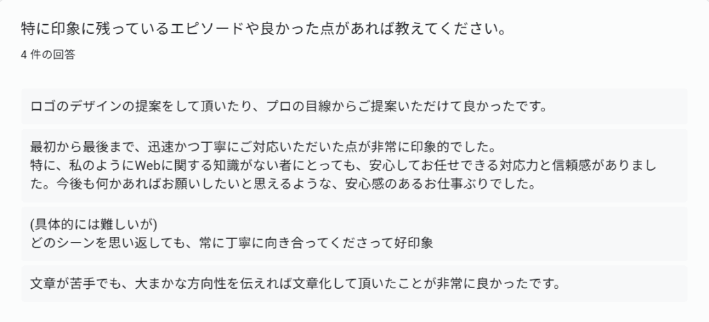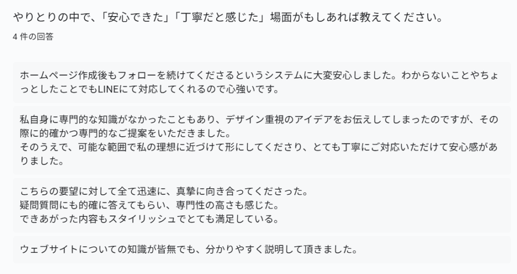 やりとりの中で、「安心できた」「丁寧だと感じた」場面がもしあれば教えてください。